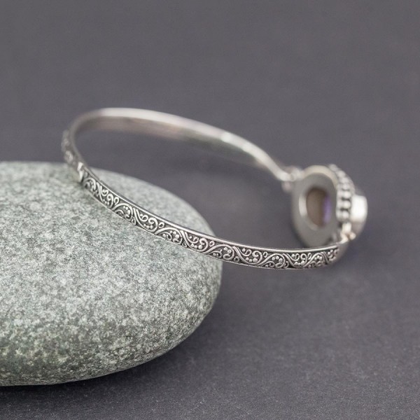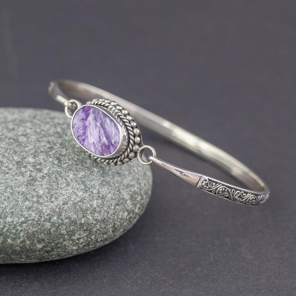 Bransoletka od podstaw wykonana ręcznie ze srebra próby 925 z oprawionym kamieniem czaroitu. Wielkość kamienia 9x14 mm. Wielkość tarczy z oprawionym kamieniem 18x14 mm. Obręcz bransoletki została ozdobiona ręcznie, motywami typowymi dla balijskiego wzornictwa. Szerokość obręczy 3,5 mm. Bransoletka będzie pasowała na nadgarstek o obwodzie 15,5-17 cm.
