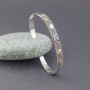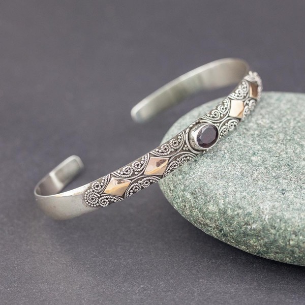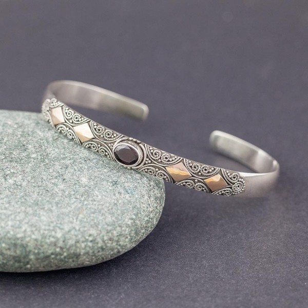 Elegancka bransoletka wykonana ręcznie ze srebra próby 925 oraz 18-karatowego złota. W centrum bransoletki oprawiony został kamień granatu wielkości 7x5 mm. Rozmiar bransoletki regulowany (będzie pasowała na szczupły nadgarstek o obwodzie 15,5-17 cm). Szerokość obręczy 6,5 mm.