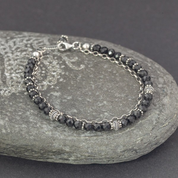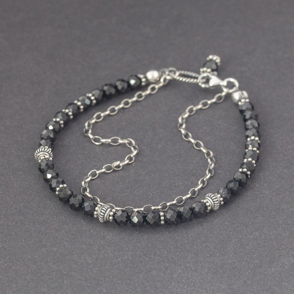 Kamienie czarnego turmalinu (4 mm) ozdobione ręcznie wykonanymi przekładkami bali. Dodatkową ozdobę bransoletki stanowi srebrny oksydowany łańcuszek oraz przywieszka z kamieniem turmalinu umieszczona na końcu bransoletki. Długość bransoletki 18,2. Całość od podstaw wykonana została ręcznie.
