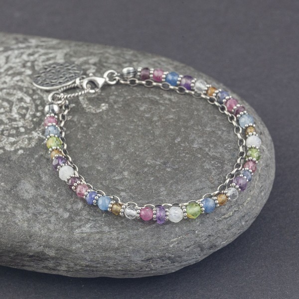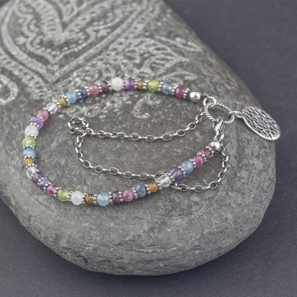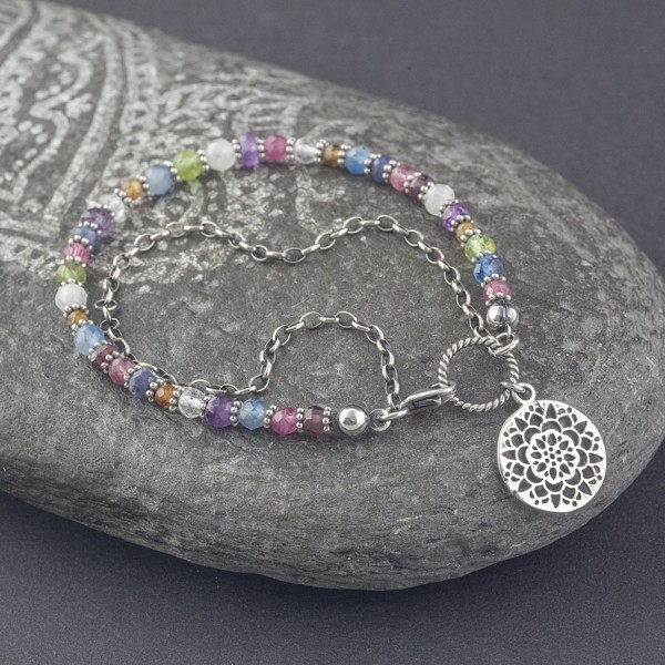 Mix kamieni naturalnych: kryształ górski (4 mm), kamień księżycowy (4,5 mm), peridot (4 mm), ametyst (4,5 mm), turmalin (3 mm i 4 mm), akwamaryn (4 mm), granat (3,5 mm) i szafir (4 mm) ozdobione ręcznie wykonanymi przekładkami bali. Bransoletkę dodatkowo ozdabia srebrny oksydowany łańcuszek oraz przywieszka w formie mandali. Całość srebrna, pr. 925. Długość całkowita bransoletki 17,7 cm.