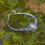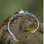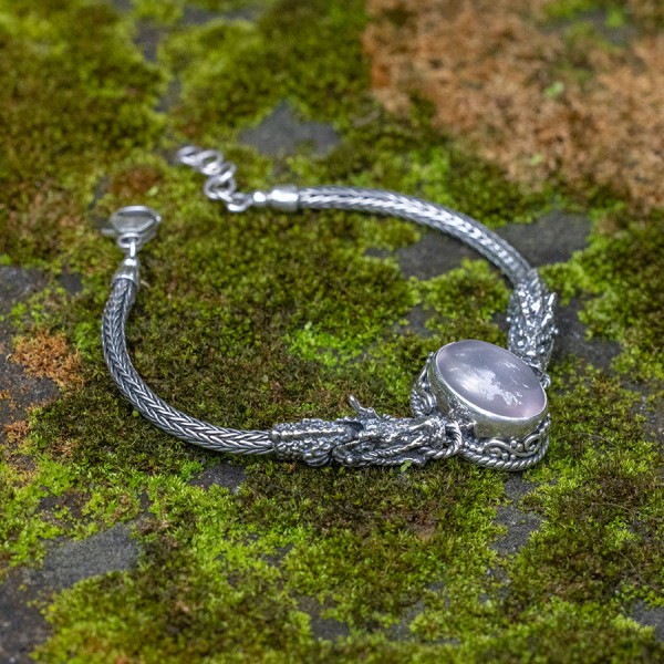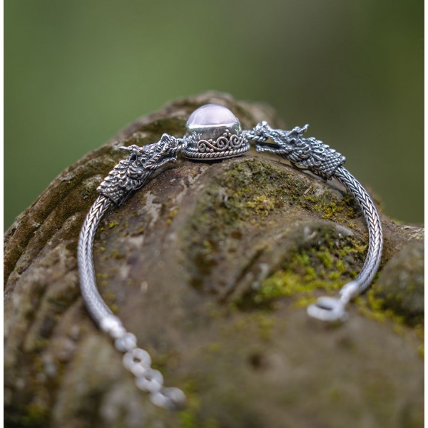 Kamień kwarcu różowego (16x11 mm) strzeżony przez dwa smoki - bransoletka od podstaw wykonana ręcznie ze srebra próby 925. Kamień ozdobiony został ręcznie wykonanym ornamentem. Smocze głowy są ruchome dzięki czemu bransoletka ładnie dopasowuje się do ręki. Długość bransoletki 18,5 cm + 1,7 cm łańcuszka wydłużającego.