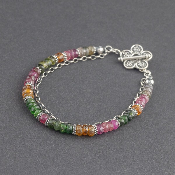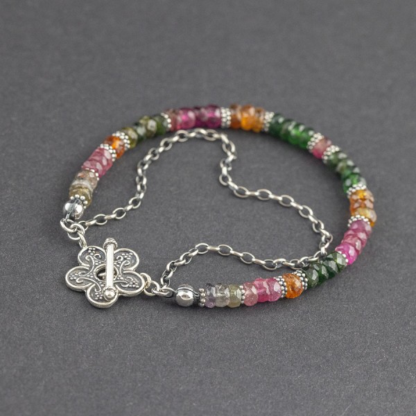 Elegancka bransoletka wykonana z kamieni turmalinu (4,5 mm) ozdobionych srebrnymi, ręcznie wykonanymi przekładkami bali. Dodatkową ozdobę bransoletki stanowi drobny oksydowany łańcuszek oraz ozdobne zapięcie bali. Elementy wykończeniowe srebrne, próba 925. Długość bransoletki 19,2 cm (po zapięciu 18,7 cm).