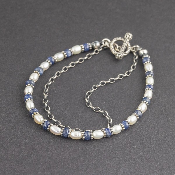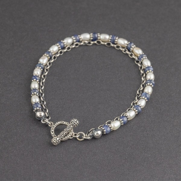Bransoletka wykonana z kamieni szafiru (4x3 mm) i białych perełek słodkowodnych (5x3 mm) ozdobionych srebrnymi przekładkami bali. Każda przekładka wykonana została ręcznie pracochłonną techniką granulacji. Dodatkową ozdobę bransoletki stanowi srebrny oksydowany łańcuszek oraz ręcznie wykonane zapięcie. Elementy wykończeniowe srebrne, próba 925. Długość bransoletki 19 cm (po zapięciu 18,5 cm).