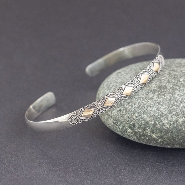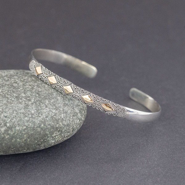 Elegancka bransoletka wykonana ręcznie ze srebra próby 925 oraz 18-karatowego złota. Rozmiar bransoletki regulowany (będzie pasowała na szczupły nadgarstek o obwodzie 15-17 cm). Szerokość obręczy 5 mm. Całość zdobień wykonana została ręcznie pracochłonną techniką granulacji.
