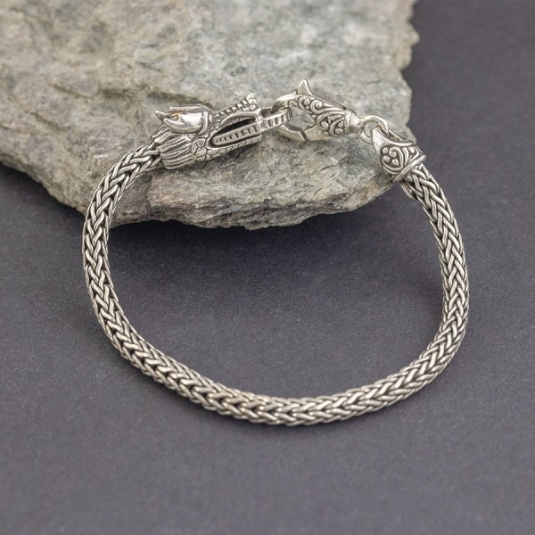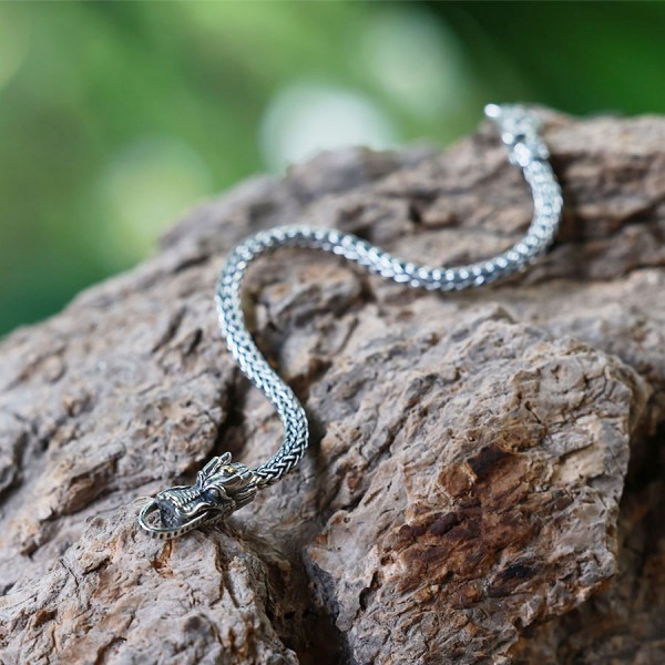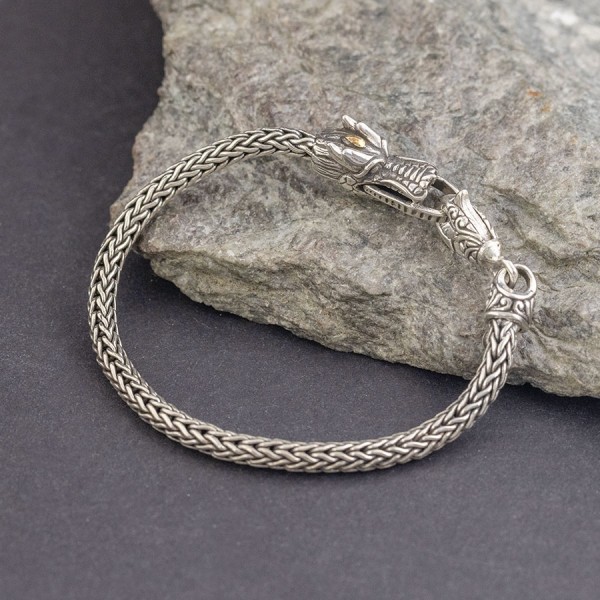 Bransoletka wykonana ręcznie ze srebra próby 925. Łańcuch został upleciony ręcznie i zakończony ozdobną głową smoka uszlachetnioną 18-karatowym złotem. Szerokość łańcucha 4 mm. Długość całkowita bransolety 18,2 cm.