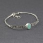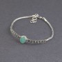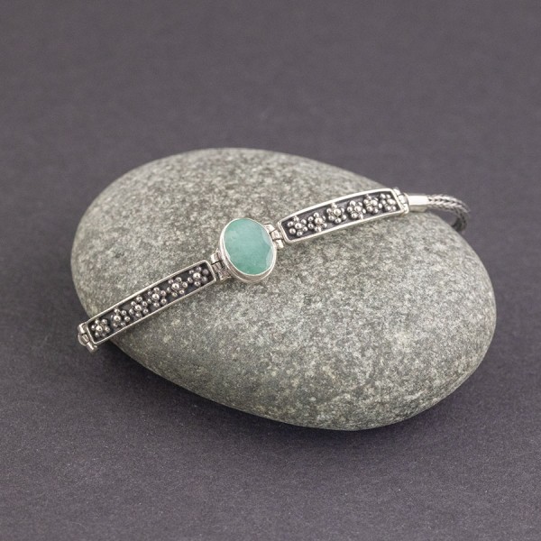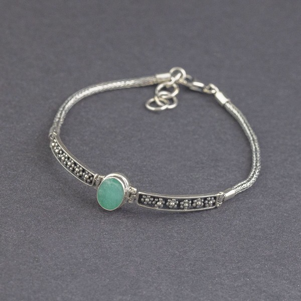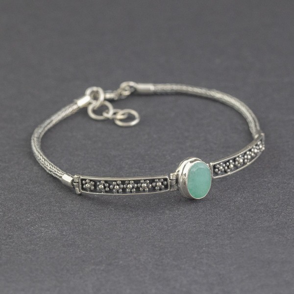 Bransoletka od podstaw wykonana ręcznie ze srebra próby 925 z oprawionym kamieniem szmaragdu. Wielkość tarczy z oprawionym kamieniem 8x10 mm. Wielkość kamienia 7x9 mm. Łańcuszki w bransoletce uplecione zostały ręcznie; szerokość łańcuszka 2 mm. Długość bransoletki 18,5 cm + 2 cm łańcuszka wydłużającego. Całość zdobień wykonana została ręcznie pracochłonną techniką granulacji.