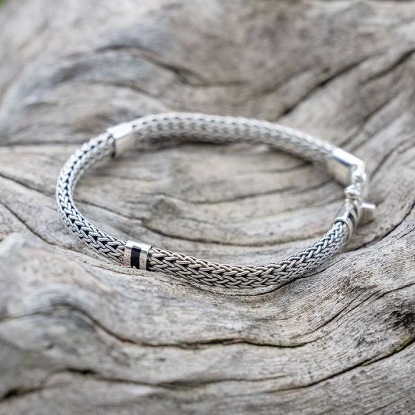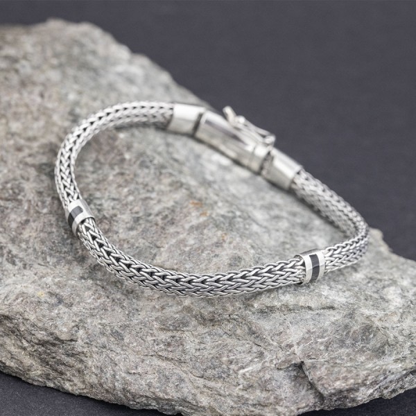 Męska bransoletka wykonana ze srebra próby 925. Łańcuch został upleciony ręcznie. Szerokość łańcucha 5 mm. Długość całkowita bransoletki 19 cm. Bransoletka ozdobiona została wstawkami wykonanymi z czarnego onyksu.