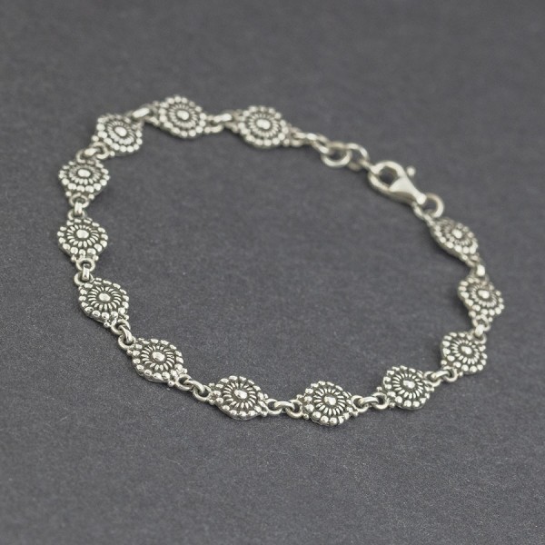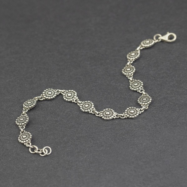 Bransoletka od podstaw wykonana ręcznie ze srebra próby 925. Każdy z elementów ozdobiony został ręcznie, pracochłonną techniką granulacji. Wielkość pojedynczego ogniwka 6,5 mm.Bransoletka można zapiąć na długości 17,5-18,5 cm.