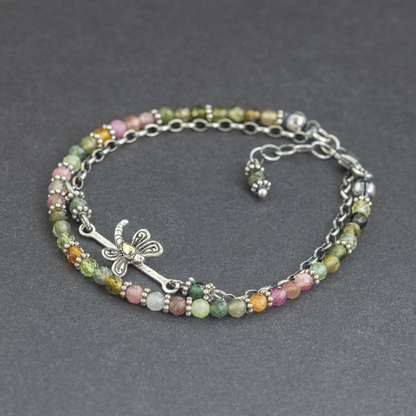 Bransoletka wykonana z kamieni turmalinu (3,5 mm) ozdobionych srebrnymi, ręcznie wykonanymi przekładkami bali. Dodatkową ozdobę stanowi drobny oksydowany łańcuszek z wplecionymi kamieniami turmalinu i łącznikiem z motywem ważki (srebro 925 i 18-karatowe złoto). Elementy wykończeniowe srebrne, próba 925. Długość całkowita bransoletki 17,3 cm + 2 cm łańcuszka wydłużającego zakończonego kamieniam turmalinu.