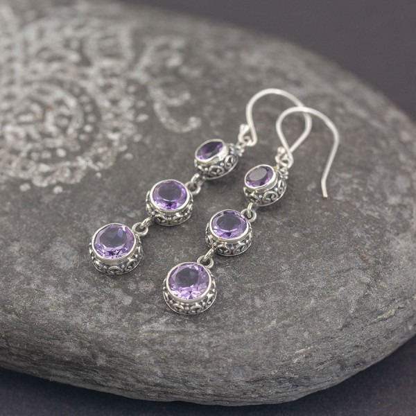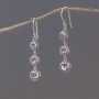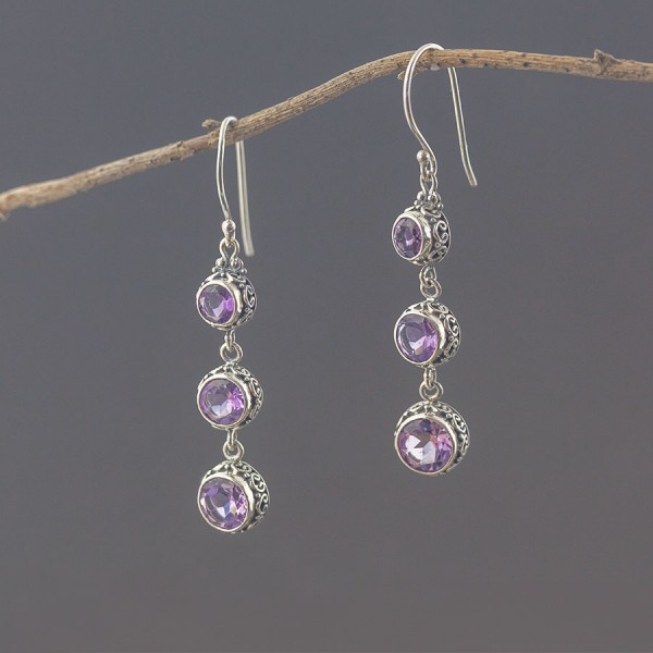 Eleganckie kolczyki od podstaw wykonane ręcznie ze srebra próby 925 z oprawionymi kamieniami ametystu. Wielkość kamieni 5 mm, 6 mm i 7 mm. Całość zdobień wykonana została ręcznie. Długość całkowita kolczyków 5,2 cm.