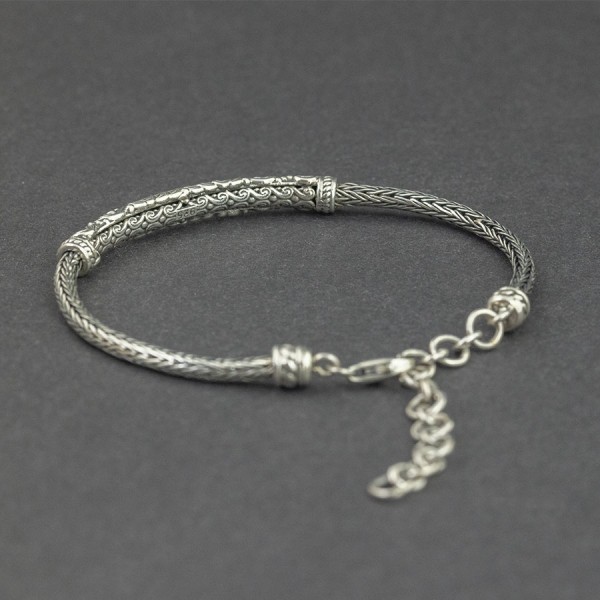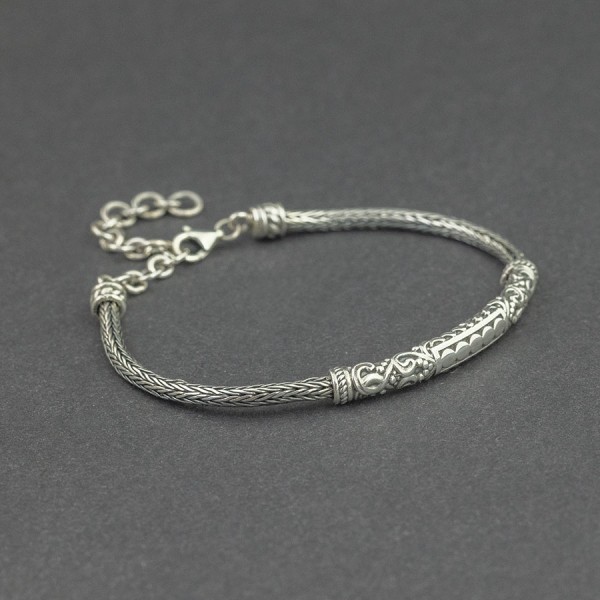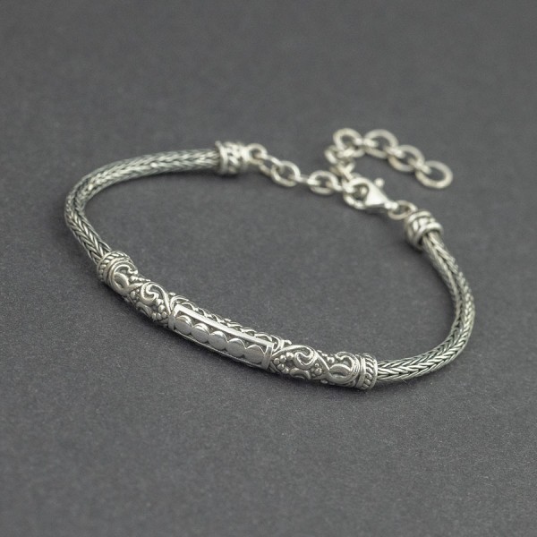 Elegancka bransoletka wykonana ręcznie ze srebra próby 925. Łańcuszek również został upleciony ręcznie. Grubość łańcuszka 2,8 mm. Wielkość ozdobnego elementu bransoletki 40x5 mm. Bransoletkę można zapiąć na długości 15-19 cm. Na uwagę zasługują zdobienia wykonane od spodu bransoletki. Bransoletka będzie pasowała na szczupły nadgarstek.