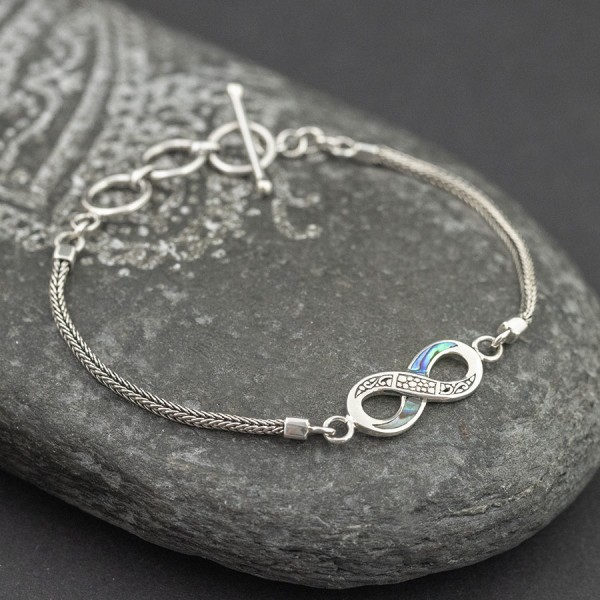 Bransoletka z symbolem nieskończoności od podstaw wykonana ręcznie ze srebra próby 925 oraz muszli paua. Wielkość znaku nieskończoności 9,5x22 mm. Łańcuszek w bransoletce upleciony został ręcznie. Grubość łańcuszka 2 mm. Bransoletka posiada trzy kółeczka pozwalające zapiąć ją na długości 18 cm, 19 cm i 20 cm. Na życzenie mogę wymienić zapięcie na karabinczyk.