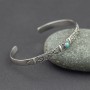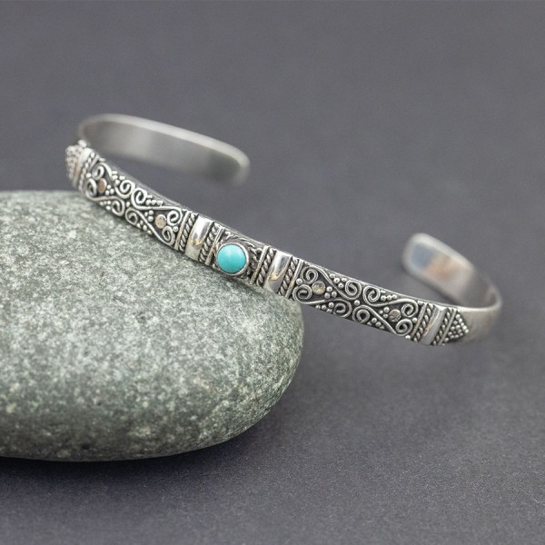 Elegancka bransoletka w całości wykonana ręcznie pracochłonną techniką granulacji. Obręcz bransoletki została ozdobiona orientalnymi motywami typowymi dla balijskiego wzornictwa. Pośród zdobień oprawiony został kamień turkusu (4 mm). Całość srebrna, próba 925. Szerokość obręczy 5,5 mm. Bransoletka jest regulowana (będzie pasowała na nadgarstek 15,5-17 cm).
