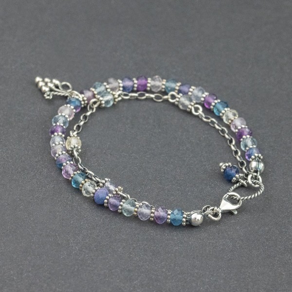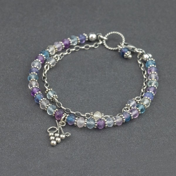 Bransoletka z kamieni fluorytu (4,5 mm) ozdobionych srebrnymi ręcznie wykonanymi przekładkami bali oraz przywieszką w formie kiści winogron. Dodatkową ozdobę bransoletki stanowi łańcuszek z wplecionymi kamieniami fluorytu. Elementy wykończeniowe srebrne, próba 925. Długość bransoletki 17,3 cm.