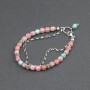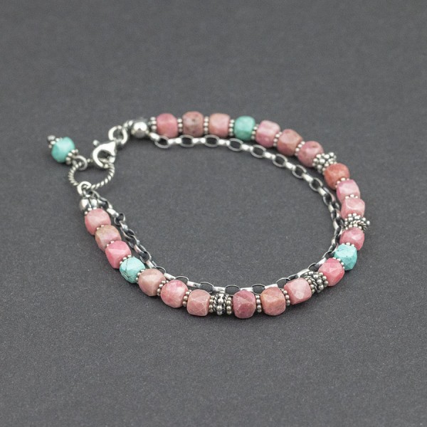 Bransoletka wykonana z kamieni rodonitu (5 mm) i turkusu (5 mm) ozdobionych srebrnymi, ręcznie wykonanymi przekładkami bali. Dodatkową ozdobę bransoletki stanowi srebrny oksydowany łańcuszek. Elementy wykończeniowe srebrne, próba 925. Długość bransoletki 18,2 cm.