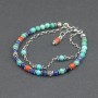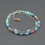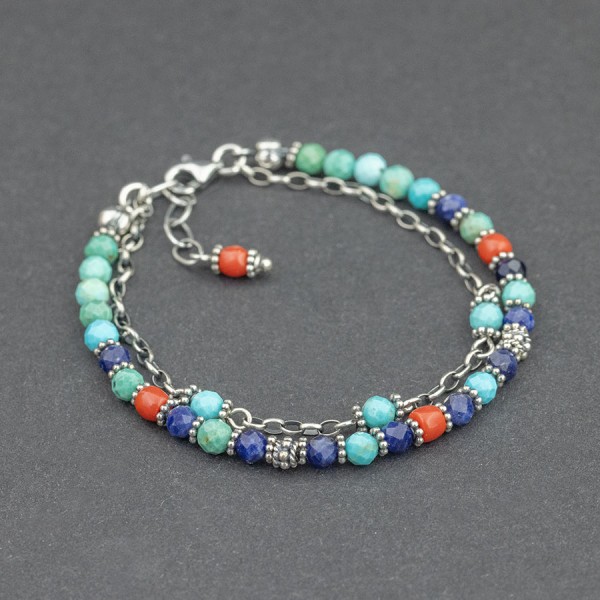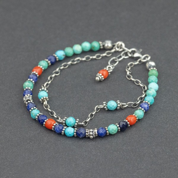 Bransoletka od podstaw wykonana ręcznie ze srebra próby 925, korala (4 mm), turkusu (4 mm) i lapisu lazuli (4 mm). Dodatkową ozdobę bransoletki stanowią ręcznie wykonane przekładki bali oraz drobny oksydowany łańcuszek z wplecionymi kamieniami turkusu. Długość bransoletki 17 cm + 1,5 cm łańcuszka wydłużającego zakończonego koralem.