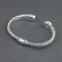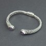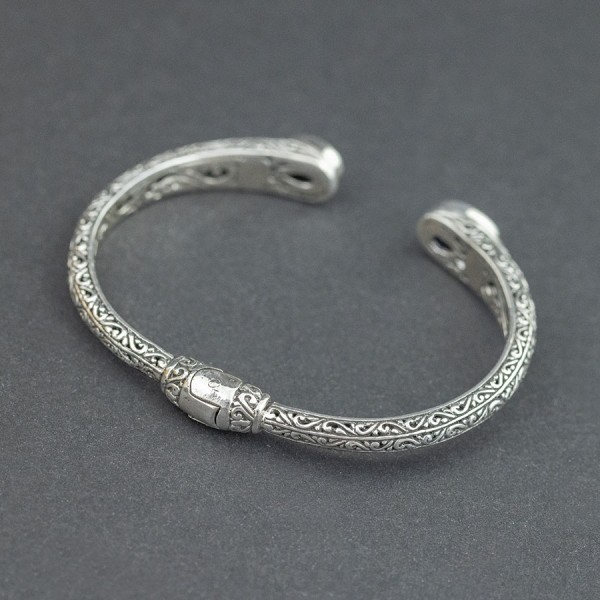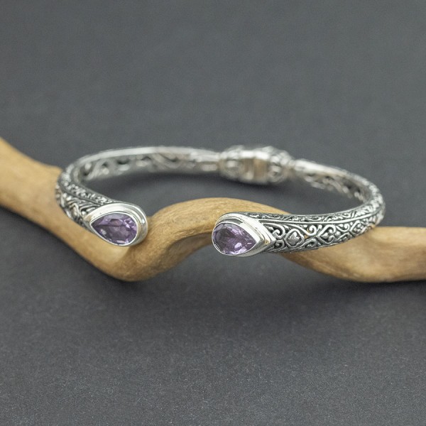Elegancka bransoletka od podstaw wykonana ręcznie ze srebra próby 925. Początek i koniec bransoletki ozdabiają kamienie ametystu. Wielkość kamieni 9x7 mm. Szerokość bransoletki w najszerszym miejscu 8 mm; w najwęższym 5 mm. Element ozdobny umieszczony w centralnej części bransoletki stanowi jednocześnie mechanizm ułatwiający zakładanie i zdejmowanie bransoletki. Bransoletka została bogato ozdobiona motywami charakterystycznymi dla balijskiego wzornictwa. Na uwagę zasługują również zdobienia wykonane od spodu bransoletki. Bransoletka będzie odpowiednia na nadgarstek o obwodzie 15,5-16,5 cm.
