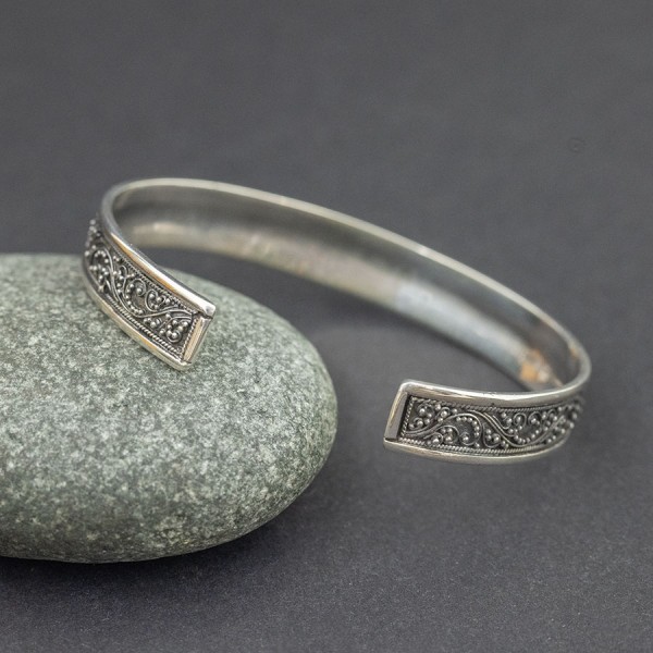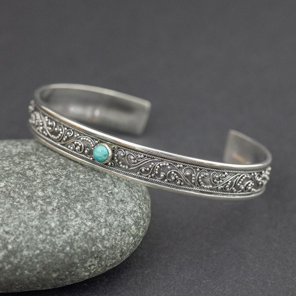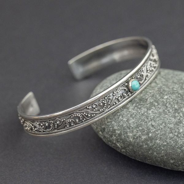 Elegancka bransoletka w całości wykonana ręcznie pracochłonną techniką granulacji. Obręcz bransoletki została bogato ozdobiona orientalnymi motywami typowymi dla balijskiego wzornictwa. Pośród zdobień oprawiony został kamień turkusu (4 mm). Całość srebrna, próba 925. Szerokość obręczy 9,5 mm. Bransoletka jest regulowana (będzie pasowała na nadgarstek 16-17,5 cm).