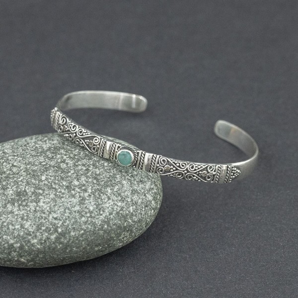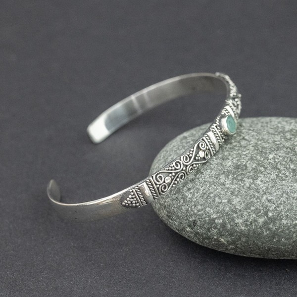 Elegancka bransoletka w całości wykonana ręcznie pracochłonną techniką granulacji. Obręcz bransoletki została ozdobiona orientalnymi motywami typowymi dla balijskiego wzornictwa. Pośród zdobień oprawiony został kamień szmaragdu (5 mm). Całość srebrna, próba 925. Szerokość obręczy 5,5 mm. Bransoletka jest regulowana (będzie pasowała na nadgarstek 16-17,5 cm).