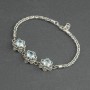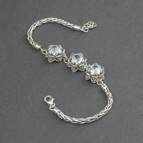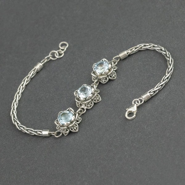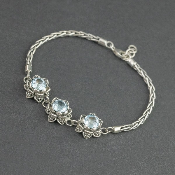 Trzy ręcznie wyrzeźbione w srebrze kwiaty lotosu (12 mm) ozdobione kamieniami błękitnego topazu. Całość srebrna, próba 925. Wielkość kamieni 7 mm. Grubość łańcuszka 3 mm. Długość bransoletki 18,5 cm + 1,5 cm łańcuszka wydłużającego.