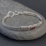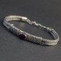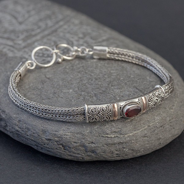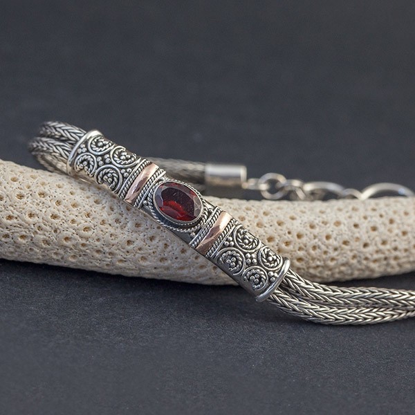 Ekskluzywna bransoletka wykonana ze srebra próby 925 z pięknie zdobioną powierzchnią oraz oprawionym pośrodku granatem (7x5 mm). Całość zdobień oraz łańcuch wykonane ręcznie. Część elementów pokryta została 18-karatowym złotem. Długość całkowita bransoletki 19 cm. Wielkość ozdobnego elementu 32x7 mm; szerokość pojedynczego łańcuszka 3 mm. Bransoletka posiada dwa kółeczka pozwalające regulować jej długość w przedziale 18-19 cm.
