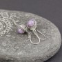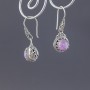 Eleganckie kolczyki, których podstawę stanowią kamienie czaroitu (8 mm) oprawione w srebro próby 925. Kolczyki ozdobione są ręcznie wykonanym ornamentem. Bigle również zostały wykonane i ozdobione ręcznie. Wielkość tarczy kolczyka 11,5 mm. Długość całkowita kolczyków 3,3 cm.