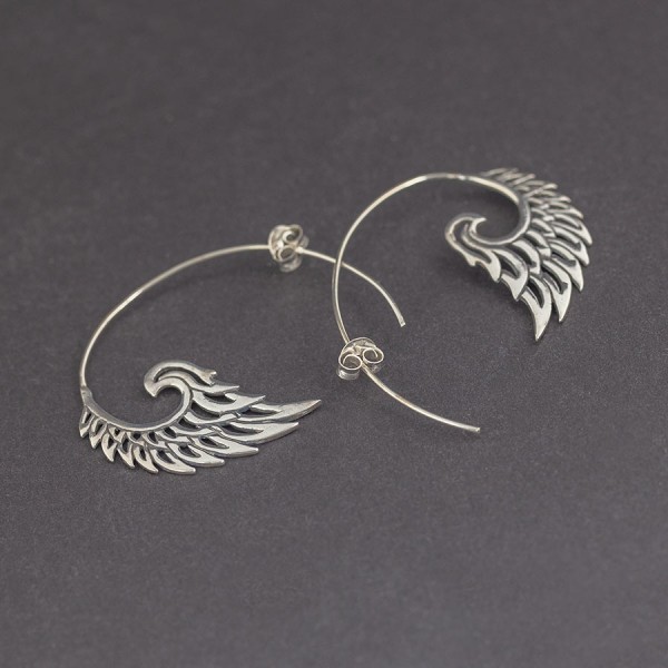 Kolczyki od podstaw wykonane ręcznie ze srebra próby 925. Wielkość skrzydła 33x20 mm. Długość bigla 4,5 cm.