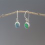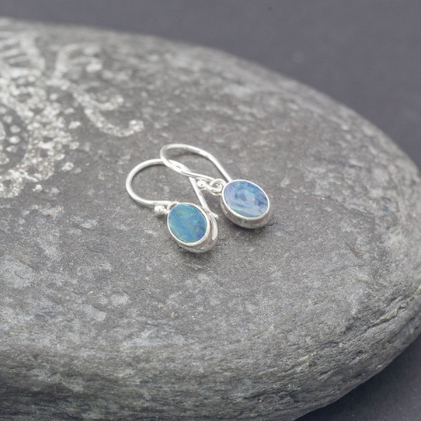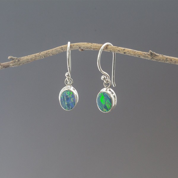 Kolczyki wykonane ze srebra próby 925 z oprawionymi kamieniami opalu australijskiego (5x7 mm). Wielkość tarcz kolczyków 6,x8 mm. Długość całkowita kolczyków 2,3 cm. Kolczyki od podstaw zostały wykonane ręcznie. Kolczyki stworzone z myślą o Paniach lubiących drobną biżuterię.