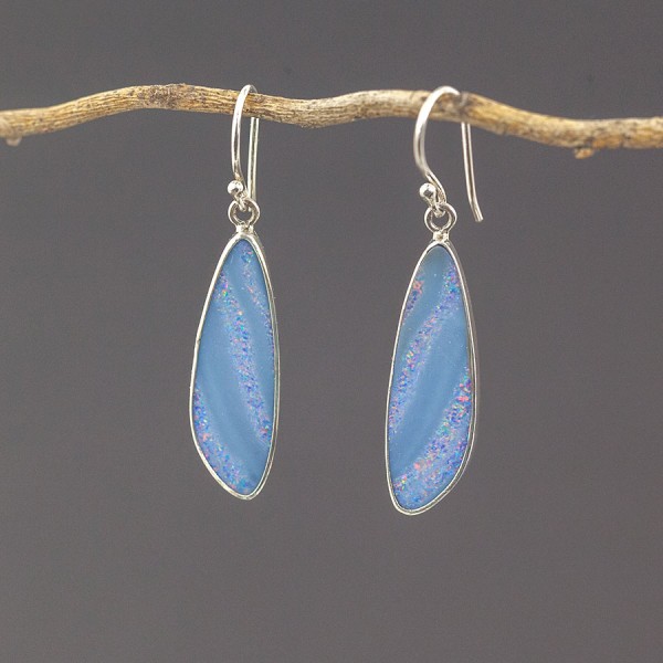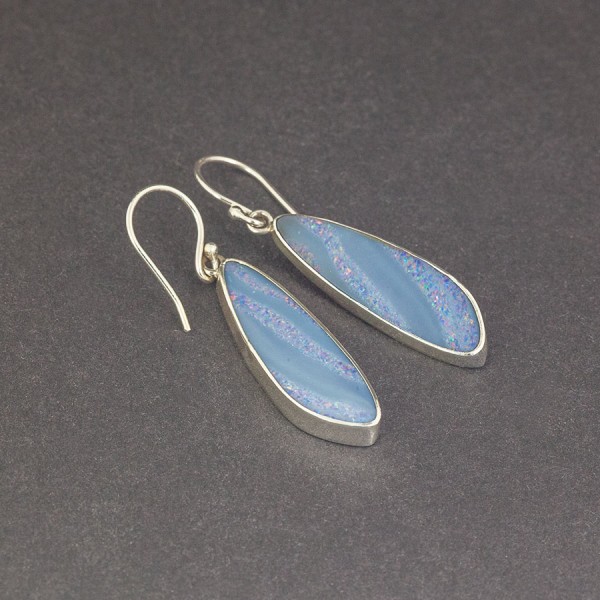 Absolutnie niezwykłe opale australijskie (typu dublet) ubrane w srebro próby 925. Kolczyki od podstaw wykonane ręcznie. Wielkość opalu 26x8 mm. Długość całkowita kolczyków 4,1 cm. Pojedynczy, niepowtarzalny egzemplarz.