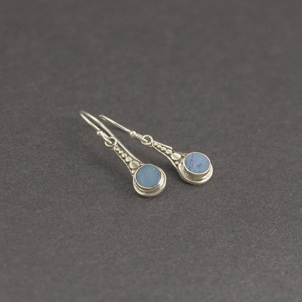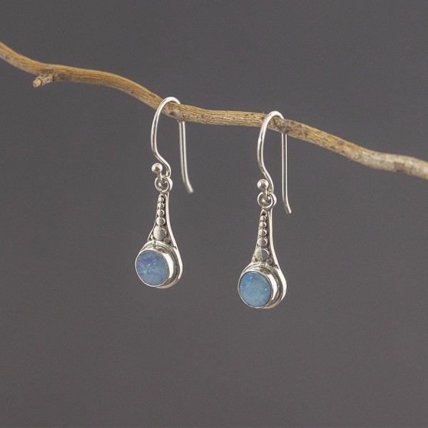 Kolczyki wykonane ze srebra próby 925 z oprawionymi kamieniami opalu australijskiego (typu dublet). Wielkość kamieni 6 mm. Długość całkowita kolczyków 3,5 cm. Kolczyki stworzone z myślą o Paniach lubiących drobną biżuterię.