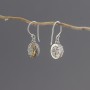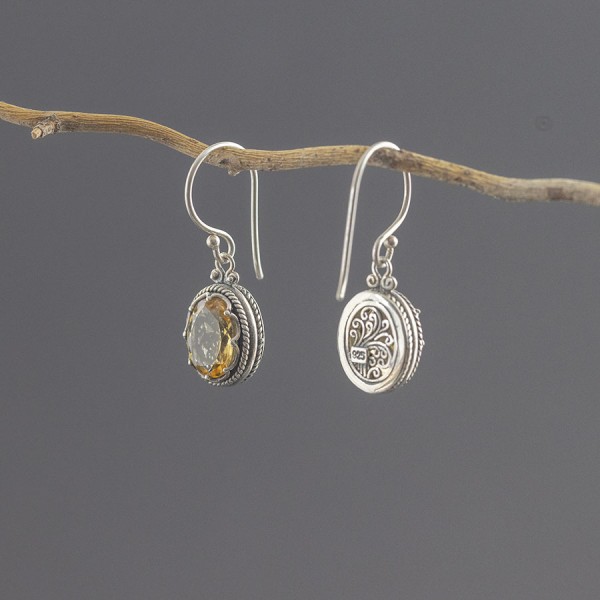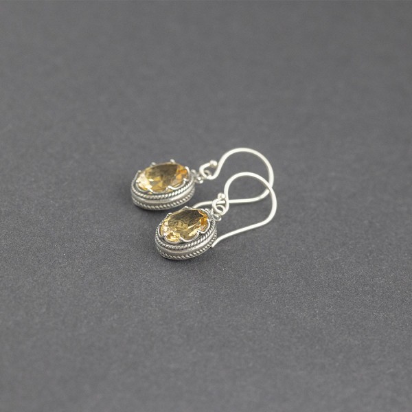 Kolczyki wykonane ze srebra próby 925 z oprawionymi kamieniami cytrynu (7x10 mm). Wielkość tarcz kolczyków 11x13 mm. Długość całkowita kolczyków 3,1 cm. Na uwagę zasługuje ozdobny tył kolczyków.