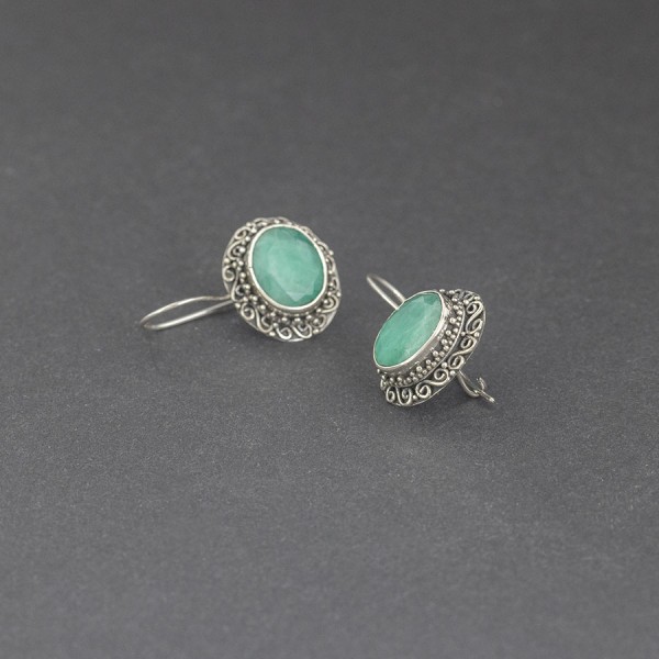 Kolczyki w orientalnym stylu od podstaw wykonane ręcznie ze srebra próby 925 oraz kamieni szmaragdu. Wielkość kamieni 10x12 mm. Wielkość tarczy kolczyka 17x15 mm. Bok kolczyka ozdobiony został ręcznie wykonanym ornamentem. Długość całkowita kolczyków 2,9 cm. Kolczyki są z tyłu zapinane. Pojedynczy egzemplarz!