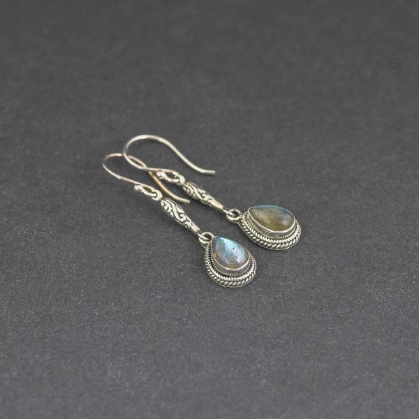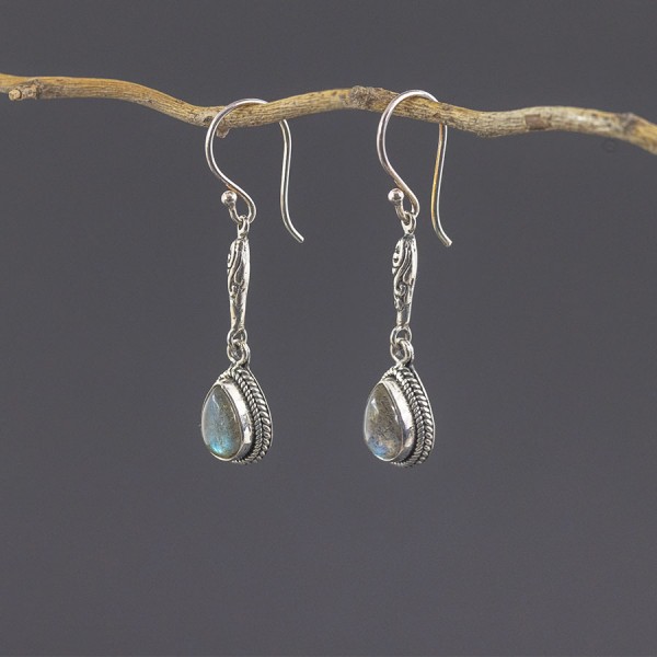 Kolczyki, których podstawę stanowią kamienie labradorytu (6x8 mm) oprawione w srebro próby 925. Kolczyki ozdobione są ręcznie wykonanym ornamentem. Wielkość tarczy kolczyka 9x12 mm. Długość całkowita kolczyków 4,2 cm.