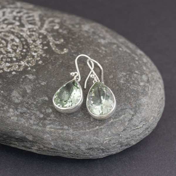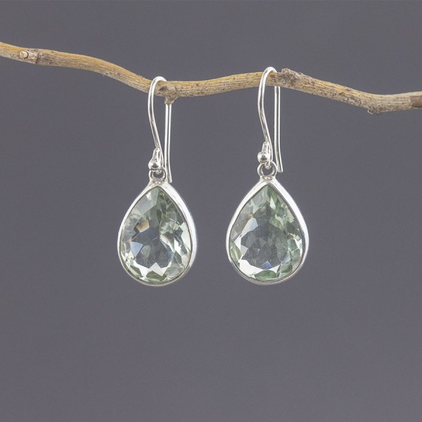 Eleganckie kolczyki od podstaw wykonane zostały ręcznie ze srebra próby 925 z oprawionym kamieniem zielonego ametystu. Wielkość kamienia 12x16 mm. Wielkość tarczy kolczyka 14x18 mm.