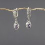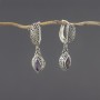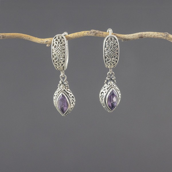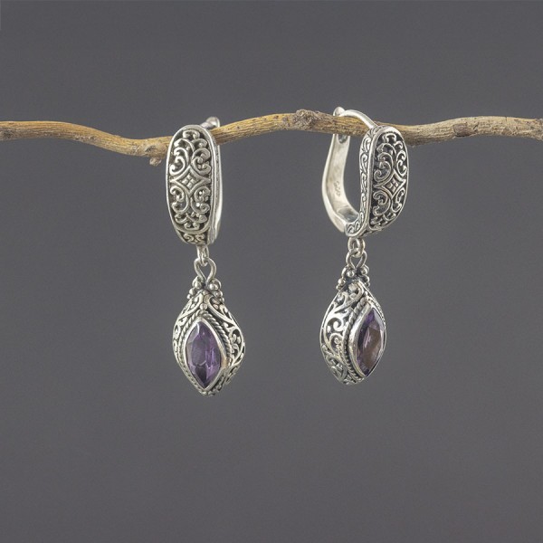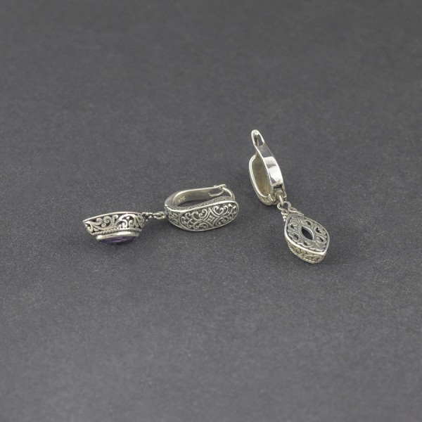 Eleganckie kolczyki w orientalnym stylu od podstaw wykonane zostały ręcznie ze srebra próby 925 oraz kamieni ametystu. Wielkość kamieni 5x10 mm. Kolczyki ozdobione zostały ręcznie wykonanym ornamentem. Bigle również zostały bogato ozdobione motywami typowymi dla balijskiego wzornictwa. Wielkość tarczy kolczyka z oprawionym kamieniem 17x10 mm. Długość całkowita kolczyków 3,8 cm. Na uwagę zasługuje również ręcznie ozdobiony, ażurowy tył kolczyków.