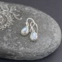 Eleganckie kolczyki od podstaw wykonane zostały ręcznie ze srebra próby 925 z oprawionymi kamieniami księżycowymi. Wielkość kamieni 9x6 mm. Wielkość tarczy kolczyka 12x9 mm. Długość całkowita kolczyków 2,7 cm. Bok kolczyków ozdobiony został ręcznie wykonanym ornamentem.
