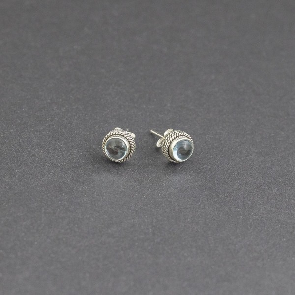 Kolczyki - sztyfty od podstaw wykonane ręcznie ze srebra próby 925 z oprawionymi kamieniami błękitnego topazu. Bok kolczyka ozdobiony został ręcznie wykonanym ornamentem. Wielkość kamieni 6 mm. Wielkość kolczyków 8 mm.
