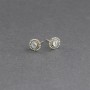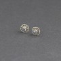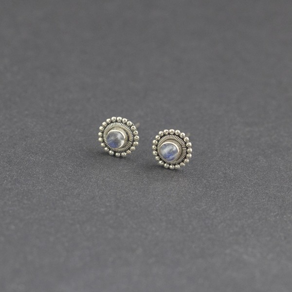 Kolczyki - sztyfty od podstaw wykonane ręcznie ze srebra próby 925 z oprawionymi kamieniami księżycowymi. Całość zdobień wykonana została ręcznie, pracochłonną techniką granulacji. Wielkość kamieni 4 mm. Wielkość kolczyków 9 mm.
