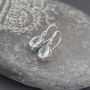 Eleganckie kolczyki od podstaw wykonane zostały ręcznie ze srebra próby 925 z oprawionymi kamieniami księżycowymi. Wielkość kamieni 7x10 mm. Wielkość tarczy kolczyka 12x9 mm. Długość całkowita kolczyków 2,7 cm. Bok kolczyków ozdobiony został ręcznie wykonanym ornamentem.