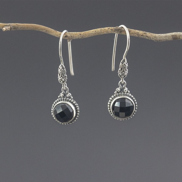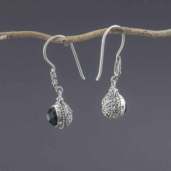 Eleganckie kolczyki, których podstawę stanowią kamienie onyksu (7 mm) oprawione w srebro próby 925. Kolczyki ozdobione są ręcznie wykonanym ornamentem. Bigle również zostały wykonane i ozdobione ręcznie. Na uwagę zasługuje ażurowe zdobienie z tyłu kolczyka. Wielkość tarczy kolczyka 11 mm. Długość całkowita kolczyków 3,7 cm.