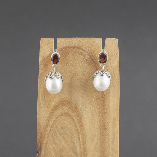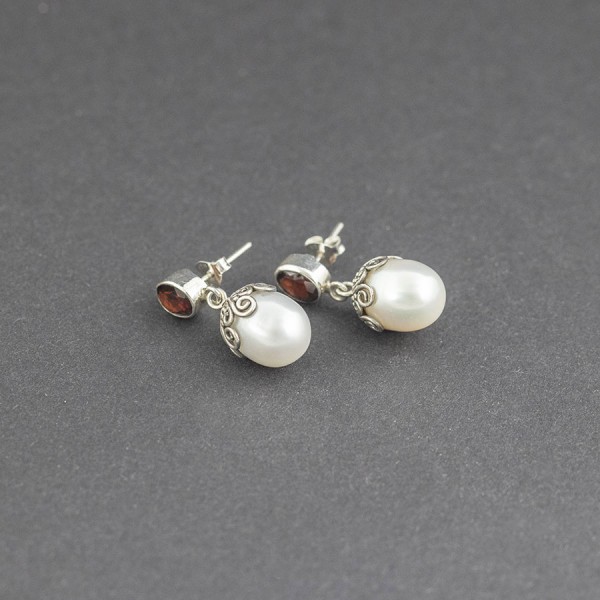 Eleganckie kolczyki od podstaw wykonane zostały ręcznie ze srebra próby 925. Białe perły słodkowodne (10x13 mm) otrzymały ręcznie zdobione czapeczki a sztyft ozdabia kamień granatu (5x7 mm). Długość całkowita kolczyków 2,7 cm.