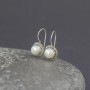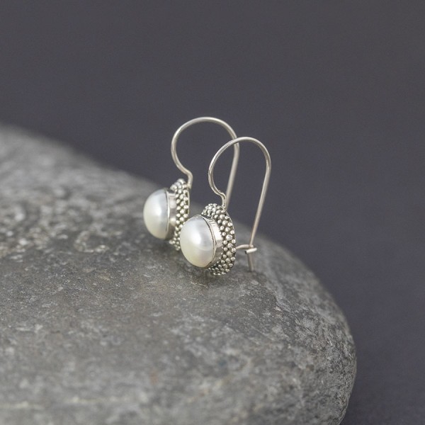 Eleganckie kolczyki, których podstawę stanowi biała perła słodkowodna (8 mm) oprawiona w srebro próby 925. Kolczyki z boku ozdobione są ręcznie wykonanym ornamentem. Wielkość tarczy kolczyka 12 mm. Długość całkowita kolczyków 2,4 cm. Kolczyki są z tyłu zapinane.