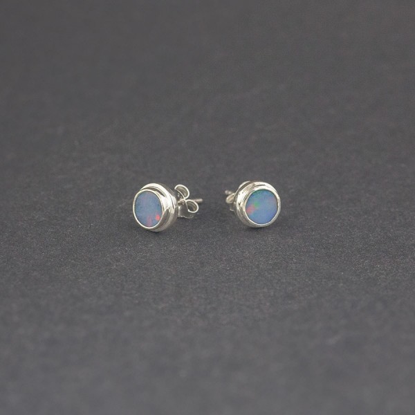 Kolczyki - sztyfty wykonane ze srebra próby 925 z oprawionymi kamieniami opalu australijskiego (6 mm). Wielkość kolczyków 7,5 mm.