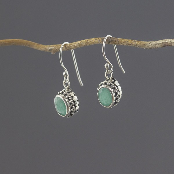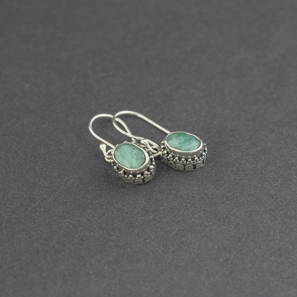 Kolczyki w orientalnym stylu od podstaw wykonane ręcznie ze srebra próby 925 oraz kamieni szmaragdu. Wielkość kamieni 6x8 mm. Wielkość tarczy kolczyka 8x10 mm. Bok kolczyka ozdobiony został ręcznie wykonanym ornamentem. Długość całkowita kolczyków 2,7 cm. Kolczyki stworzone z myślą o Paniach lubiących drobną biżuterię.
