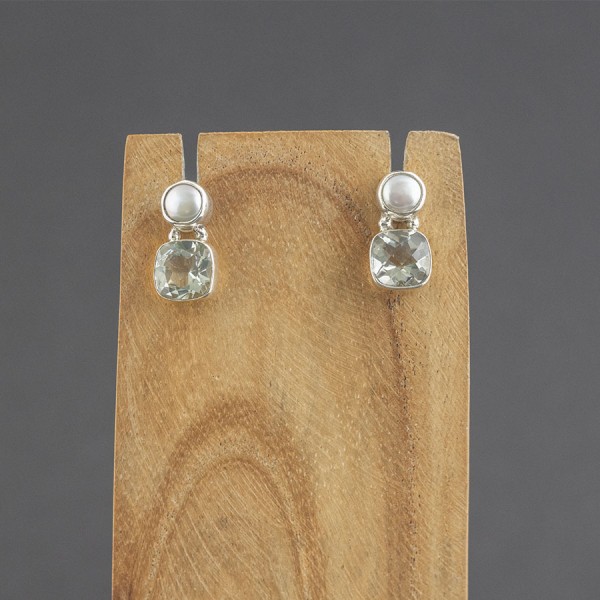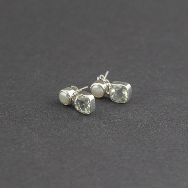 Kolczyki - sztyfty, których podstawę stanowią kamienie zielonego ametystu (8 mm) oraz perła (6 mm) oprawione w srebro próby 925. Długość całkowita kolczyków 1,8 cm.