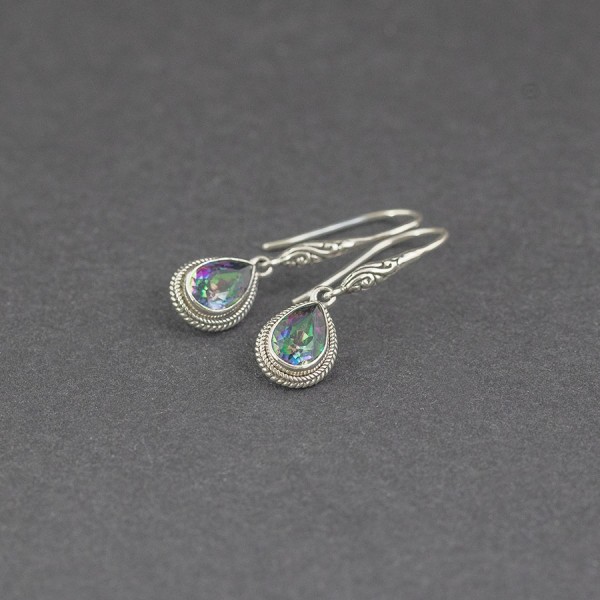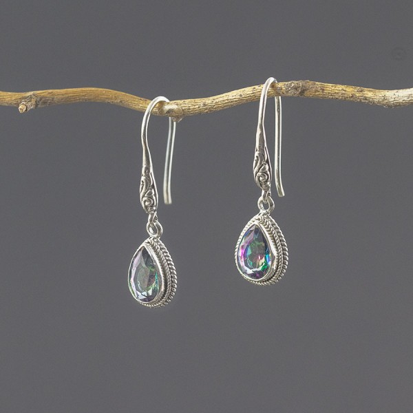 Kolczyki, których podstawę stanowią kamienie topazu mystic (6x8 mm) oprawione w srebro próby 925. Kolczyki ozdobione są ręcznie wykonanym ornamentem. Wielkość tarczy kolczyka 9x11 mm. Długość całkowita kolczyków 3,9 cm.