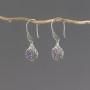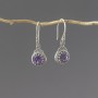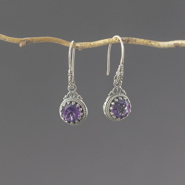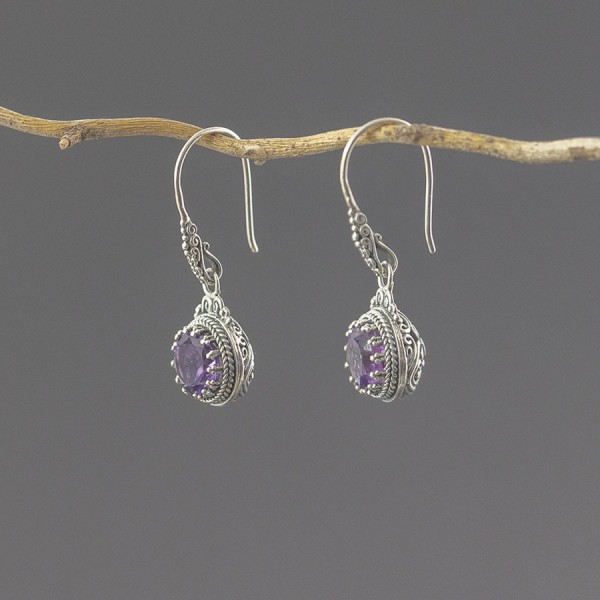 Eleganckie kolczyki, których podstawę stanowią kamienie ametystu (8 mm) oprawione w srebro próby 925. Kolczyki ozdobione są ręcznie wykonanym ornamentem. Bigle również zostały wykonane i ozdobione ręcznie. Na uwagę zasługuje ażurowe zdobienie z tyłu kolczyka. Wielkość tarczy kolczyka 12 mm. Długość całkowita kolczyków 3,5 cm.