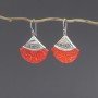 Kolczyki od podstaw wykonane ręcznie ze srebra próby 925 oraz czerwonego korala. Wielkość tarczy kolczyka 27x31 mm. Długość kolczyków 4,6 cm.