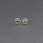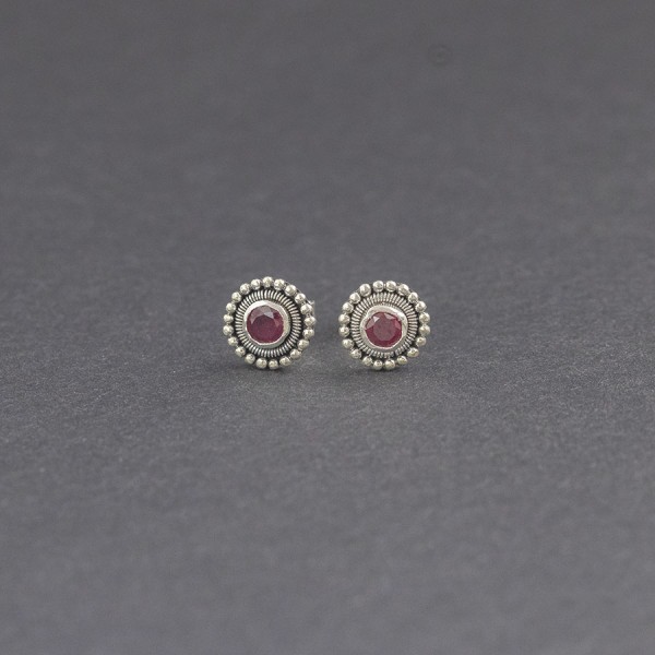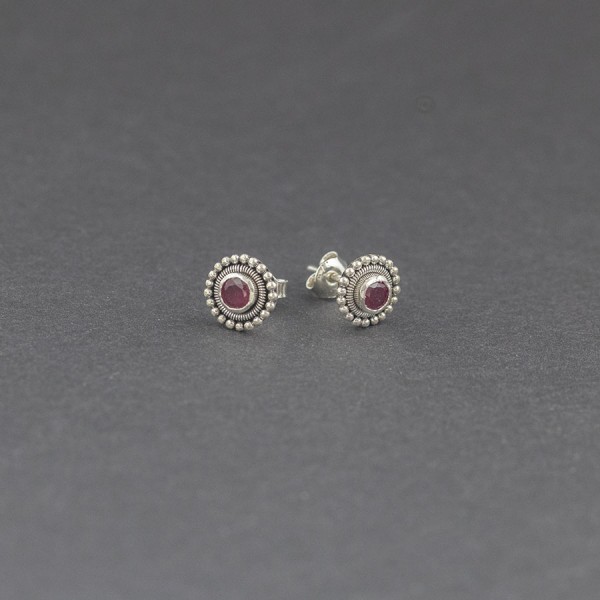 Kolczyki - sztyfty od podstaw wykonane ręcznie ze srebra próby 925 oraz kamieni granatu. Całość zdobień wykonana została ręcznie, pracochłonną techniką granulacji. Wielkość kamieni 4 mm. Wielkość kolczyków 9 mm.