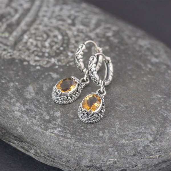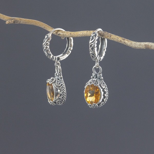 Eleganckie kolczyki, których podstawę stanowią kamienie cytrynu (7x9 mm) oprawione w srebro próby 925. Kolczyki ozdobione są ręcznie wykonanym ornamentem. Posiadają zamykane bigle rownież ozdobione ręcznie. Wielkość tarczy kolczyka 10x12 mm. Długość całkowita kolczyków 3,3 cm.